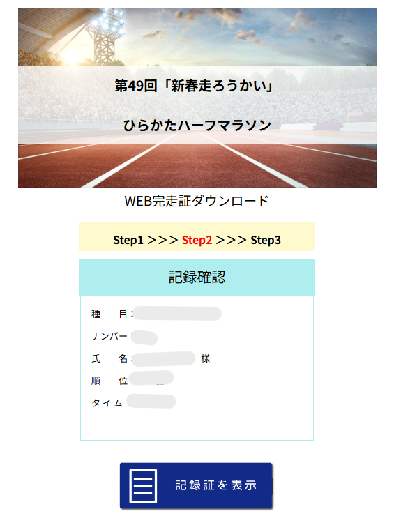 下の方にある「記録証を表示」を押すと完走証が表示されます