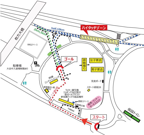 ハイタッチゾーンは以下の場所で、大会メイン会場の淀川側にある白い塔付近です(まずは参加者数の多い、ハーフと10kmの部のランナーが通過するポイントを設定しました)